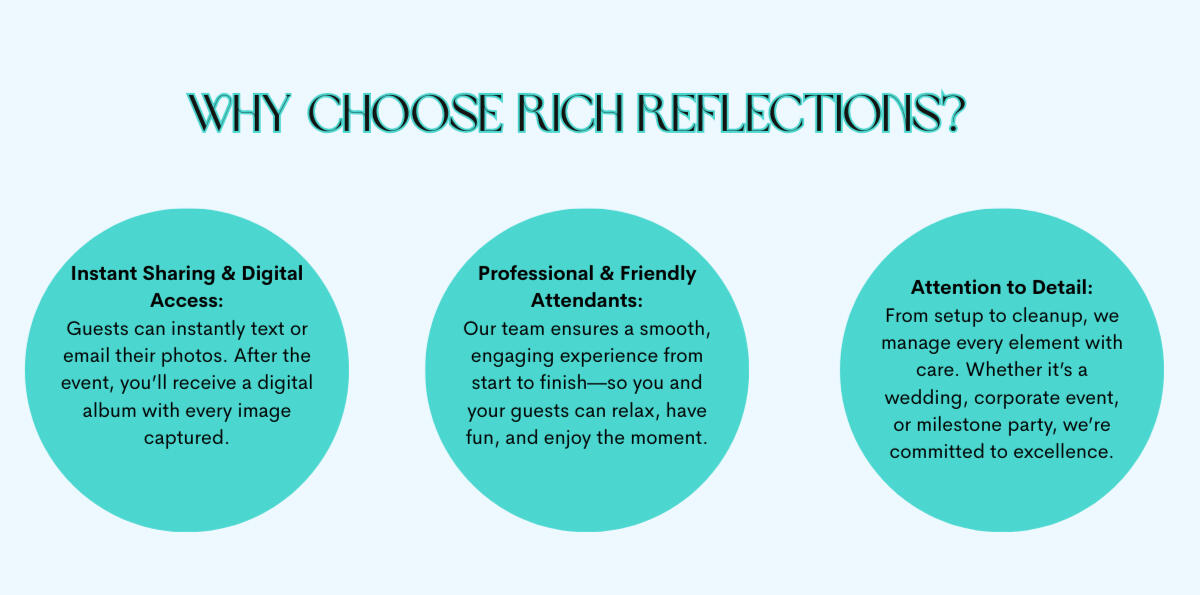 Whether you're planning a wedding, party, or celebration of life, Rich Reflections Photo Booth brings high-quality photo experiences that turn memories into tangible treasures.